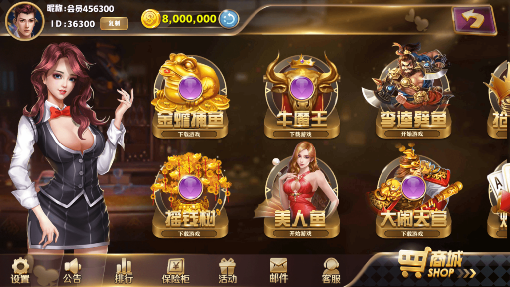 游戏:海王,李逵劈鱼,摇钱树,牛魔王,红包扫雷,皇家赛马,幸运六狮,百人牛牛,ATT翻牌机,龙虎斗,